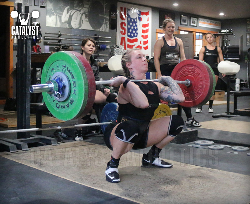 I train five times a week for about three hours per day. When I joined Catalyst, I was pretty beat up, injured and mentally defeated after being bounced around ending up in some bad situations, so Aimee had to completely start over with my training at ground zero. We started out training 3x per week with very basic fitness training (i.e., step ups and abs) and we have built up to training with the most volume and intensity I have trained at in my career. I am very proud of all we have accomplished, changing me in to a reinvented athlete this year. Aimee programs week to week, sometimes day to day and we are finishing up a high-volume phase now in preparation for Nationals and the British Open. We are competing so many times this year, so in between competitions we stay at heavy singles for the most part.
