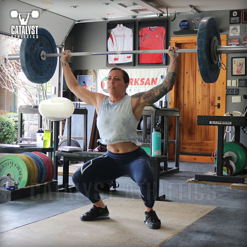 If the previous is done correctly, you can still get sagging overhead if your overhead position is incorrect or not adequately active. The shoulder blades need to be forcefully locked into full retraction and upward rotation—this creates a strong foundation for the arms and allows you to support the bar with the trunk more directly rather than through the shoulders themselves, which is a pretty soft system. The trunk needs to be leaned forward very slightly, the head pushed through the arms, and the bar over the back of the neck. This position is the same for the snatch and the jerk.