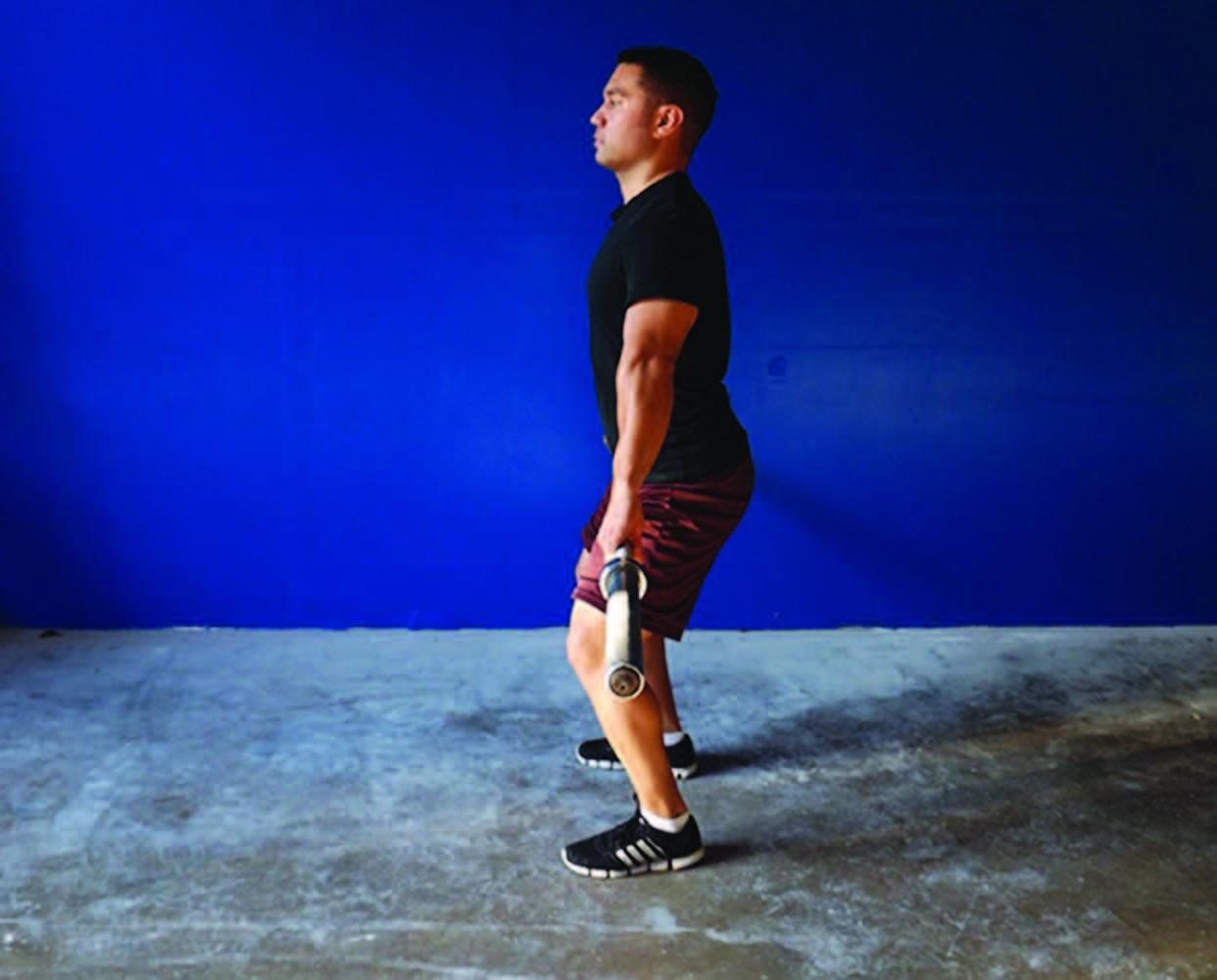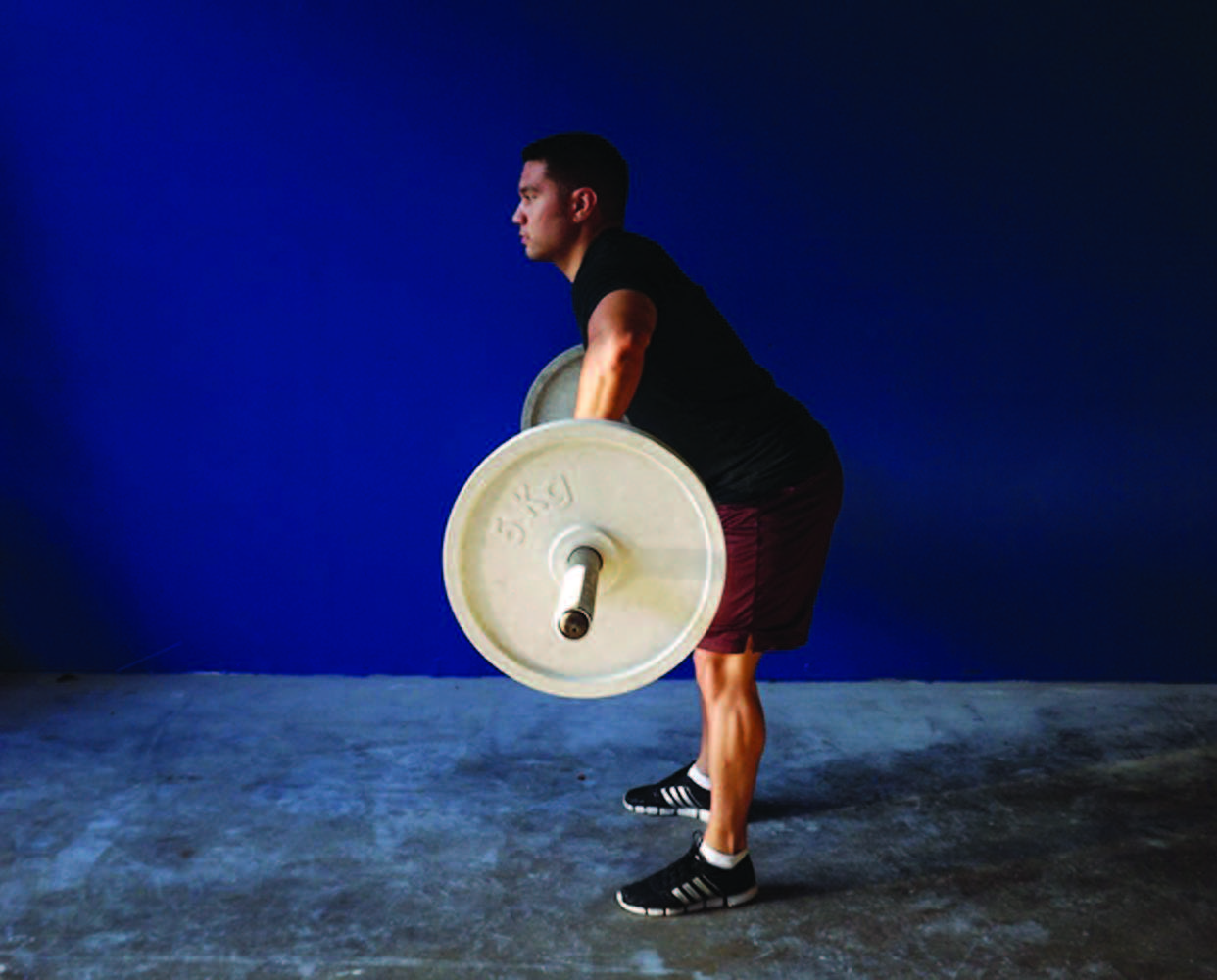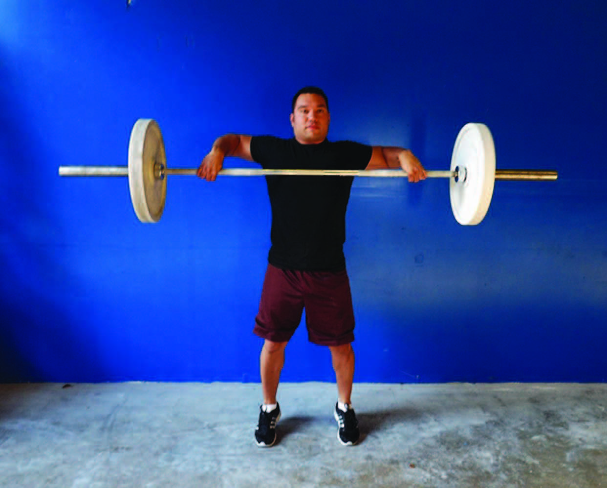 During the start position, you should have been taught to begin with the barbell against the shins. Failure to do so causes the bar to roll out in front of the lifter, and we all know how extremely difficult that makes it on the part of the athlete to successfully lift the weight. It is kind of like carrying your groceries out in front of you with locked arms rather than carrying them against your chest; a waste of energy and completely inefficient. Of course, the goal is not for the lifter to have bruises, scrapes or wounds on their shins from dragging the barbell against their leg as they lift off the ground, but while learning to control the barbell, you may find your shins a nice shade of black and blue! The closer the barbell is to the body the more control the athlete has maximizing the force applied during the lift.