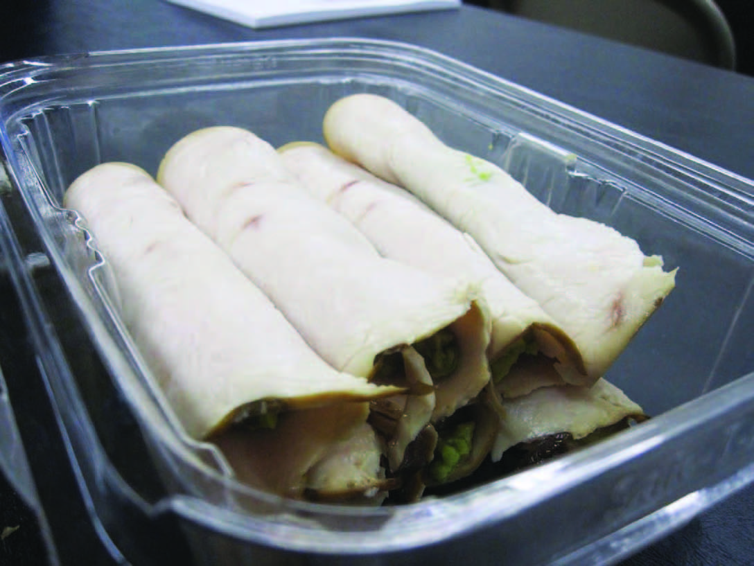 Lay out the deli meat slices. Add some to each slice, then roll up and place in a bag or container for storage.