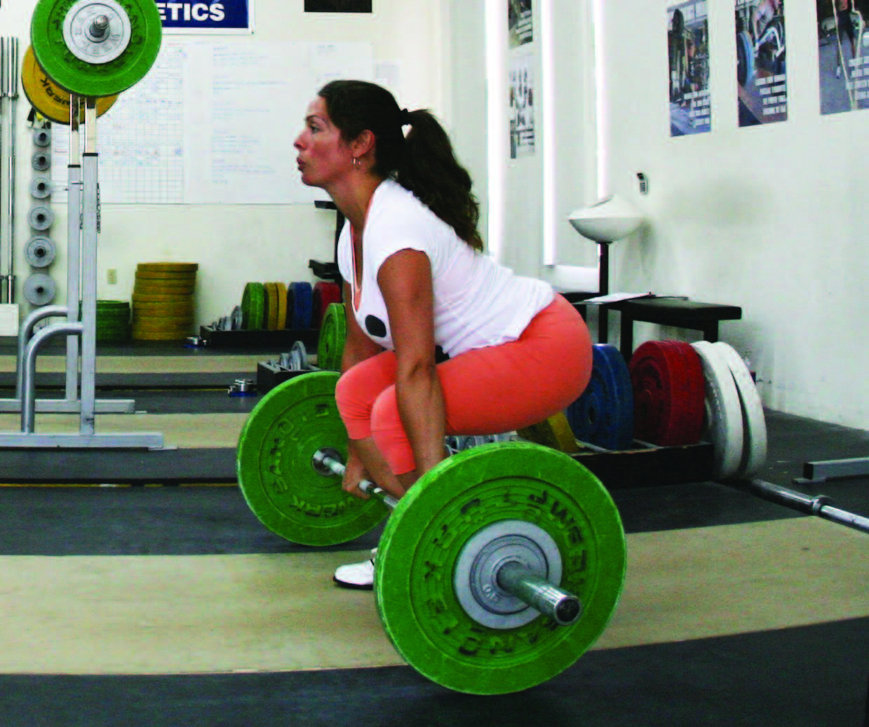 Hips- Are the hips raised to a position where the shoulders are over the bar (if you were watching the athlete from the side)? Proper hip position depends largely on the athlete’s personal body dimensions. People come in all shapes and sizes, long femurs…short femurs…long torsos…short torsos…long shins…short shins…etc. The coach will have to physically adjust the athlete to the proper position, and it will have to be individualized to suit the athlete’s build.