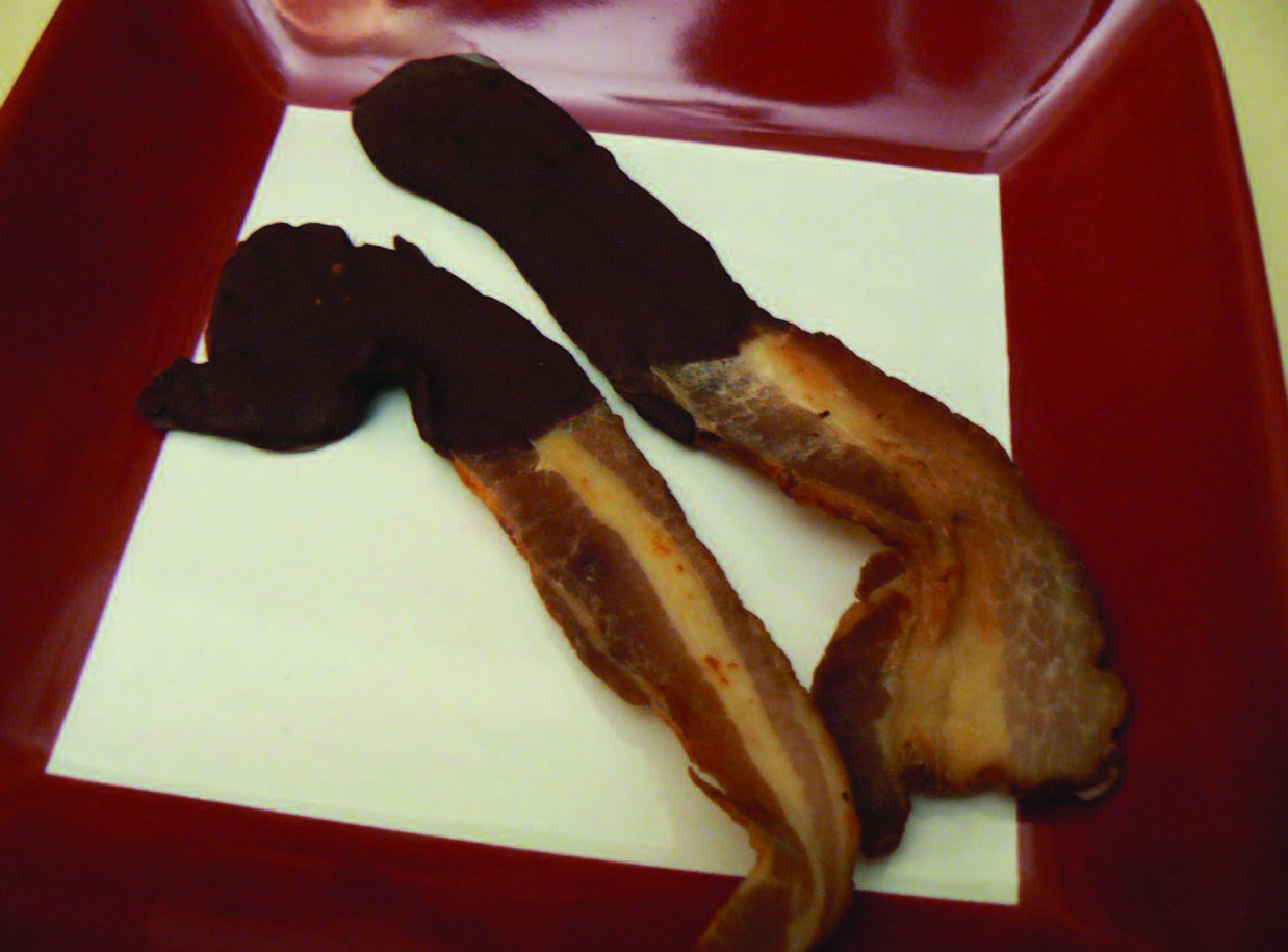 Here is a simple treat to bring to potlucks and parties. You'll only want to dip half of the bacon so that it will be easier to eat without getting chocolate all over your fingers!
