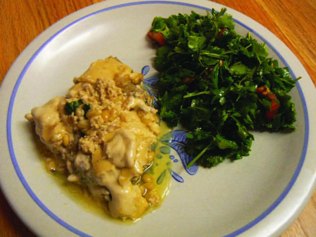 Pre-heat the oven to 350 degrees. Mix the ground lamb in a bowl with all of the Snayniyeh ingredients except the pine nuts. Spread this mixture evenly into a shallow baking pan so that the layer is 1/2 to 3/4 inches deep. Bake for 10 to 15 minutes.
