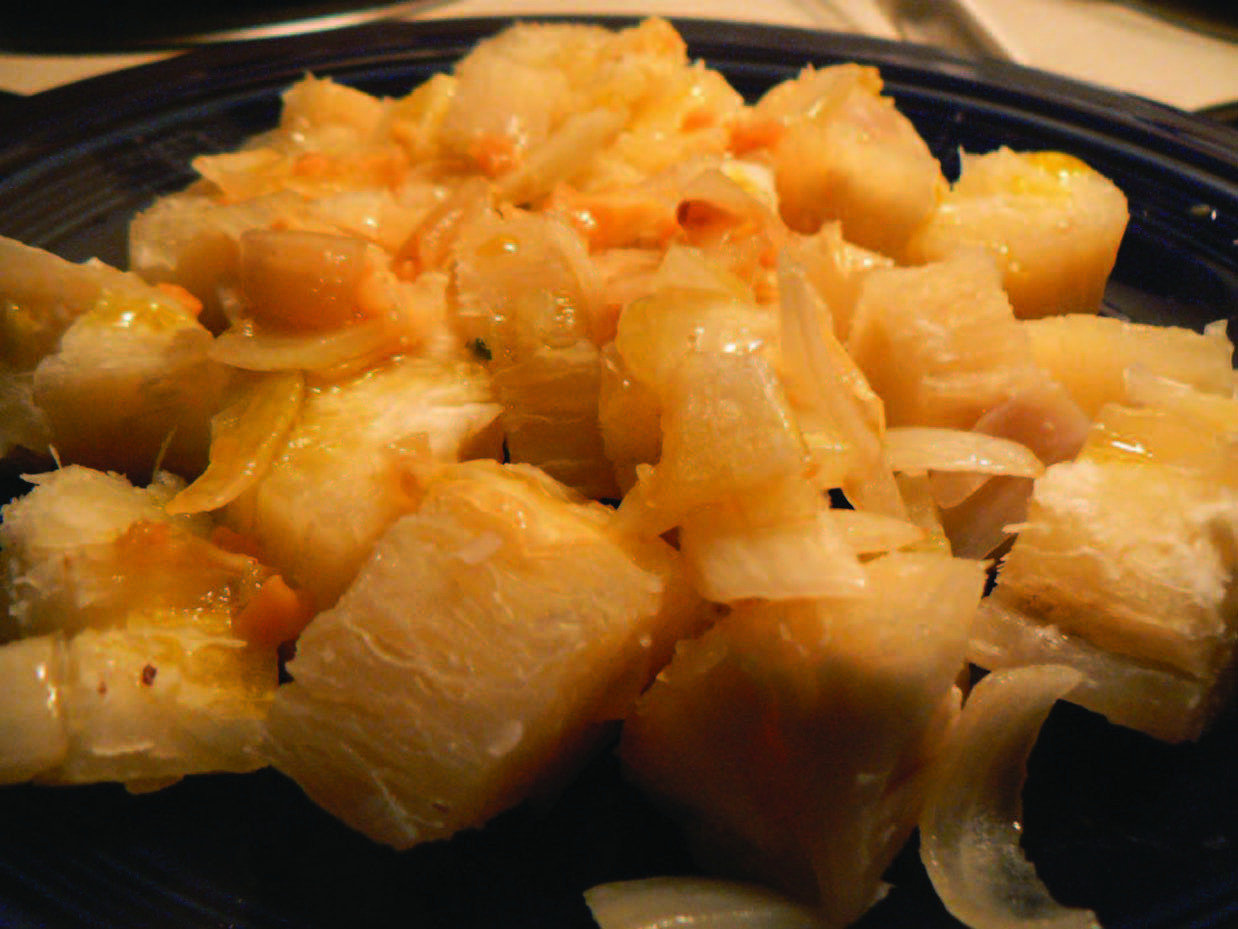 Once the yucca is done, drain the water, then plate the individual servings. Top with the sauteed mix, then drizzle with olive oil.