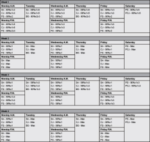 This “Junior” training program should be planned around the two major contests for a top level junior lifter— the USAW Junior Nationals (typically March) and the Junior World Championships (typically June). Table 1.1 displays a sample of how the Junior program as well as a couple of the previous training programs should be built into the yearly training. If you’re looking for a starting point it would be in July; it would be preceded by a couple weeks of easy to almost no training in the two weeks or so since the Junior Worlds. Then over the next couple months the training intensity would slowly be increased by simply changing programs until you reach the Junior program in October to begin the real training for the competitive season.