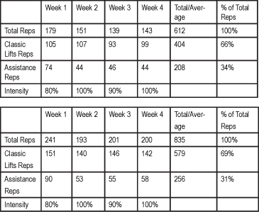 Table 1.2 is a summary of the training during the periods of six trainings per week. Now the classic lifts make up two-thirds of the training volume and the intensity of the workouts now include two-out-of-four weeks of training at 100%. Despite the obvious decrease in repetitions in the assistance exercises (squats and powers), the squats are done five days a week, but the powers are relegated to the weekend. Also, during these high-intensity periods (six and nine workouts) pulls have been abandoned completely. The only exercises used are those that will directly impact the competition results and increase the productivity of training.