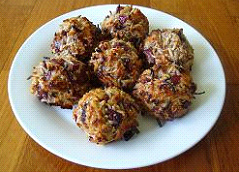 Place teaspoon size scoops of mixture onto a bak¬ing tray lined with baking paper. Place in oven for 10-15 minutes or until browned and cooked. Makes 13-15 servings.