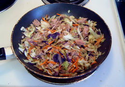 Sauté the veggies in the oil for around 3 minutes. Add the ginger, sunflower seeds, tuna, and soy sauce. Sauté for a couple of minutes longer, then serve.