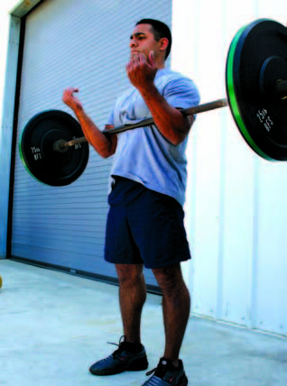 This Zercher variant increases the difficulty and range of movement dramatically. In this movement one threads the elbows under the barbell directly and does not employ the deadlift (insert spider lift start). Once the bar is fixed in the crook of the arms tension is slowly increased throughout the body. One must maintain a normal lordotic arch in the low back, weight driving through the heels and a neutral cervical spine by shifting ones gaze 6-12’ forward (insert spider lift knee level). One drives the weight upwards and once past the knees, drag the elbows along the tops of the thighs until the barbell is near the hips (insert spider lift mid thigh). From here one may bring the torso into an upright position simultaneous with hip extension. One reverses the movement by folding at the hips and slightly bending the knees allowing the elbows to trace to the hips. One may now extend forward and once past the knees, lower the barbell and the body to the floor.