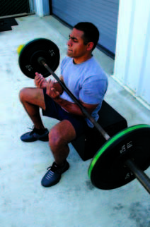 This is effectively a good-morning variation. While seated on a box or bench that is around knee height one leans forward, fixes the barbell into the crooks of the arms, tenses the body and uses primarily the low back to haul the weight up to a seated position. (Insert seated Zercher sequence) Use VERY light weight on this movement! Depending upon flexibility both the seated Zercher and the spider lift may be performed with a rounded back. This is not grounds for panic although care must be used to avoid injury. Many instances in sport and life see a full body lift performed with a rounded back. Wrestling, police arrest and control techniques and firefighting come immediately to mind. Rounded back training can be both safe and beneficial is approached with care and very light weights in the initial stages. Don’t be a wanker!
