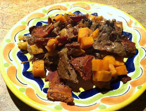 Drain the water off of the sweet potatoes and apples. Return the diced liver, bacon, and onions to the skillet, and then add the sweet potatoes and apple. Sauté for two to three minutes, stirring well. Serve dusted with salt and pepper.