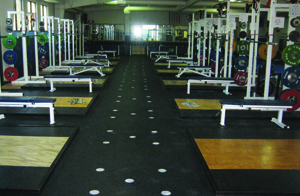 When I arrived, the weight room had eight, 8 X 8 platforms and four, 6 X 6 platforms. These were arranged in three rows of four platforms with approximately 10 -12 feet separating the rows. On one wall, the four racks supported squat stands. In the middle of the room, double-sided Samson power racks covered the platforms. On the opposite wall, the smaller platforms carried Samson half-racks. Amongst all of these platforms, were 16 adjustable benches and 4 complete sets of Uesaka bumper plates. A few other miscellaneous bumpers were scattered in 6 plate holders. The racks also held sets of metal plates. A full set of dumbbells (2 pairs of each weight from 5 lbs to 75 lbs) up to 150 lbs was located in the back of the room. Finally, several old machines (leg curl, leg extension…) as well as 4 Samson Glute-Hams were placed haphazardly near the entrance of the weight room.