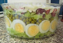 In the bottom of a large salad bowl, place half the chopped lettuce and sprinkle with some salt and pepper. Layer the eggs on top of the lettuce (standing some eggs on the edge if desired). Adding some more salt and pepper at this stage is optional. Place the peas on top of the eggs, followed by the remaining lettuce, bacon, then spreading the mayonnaise or salad dressing over the top, sealing to the edge of the bowl. Cover and place in the fridge for 24 hours or overnight; allowing the flavours time to blend is the secret to this salad. Toss before serving. Makes 12-15 servings.