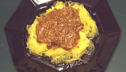 Once the squash is done, dig out the pulp, then pour the warm sauce over it. Makes 2 servings.