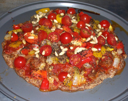 Remove from oven, add the halved tomatoes, and serve! Use a large spatula to carefully remove the slices from the pan, as the nutty "dough" won't be as crisp as traditional grain dough. Makes 4 servings.