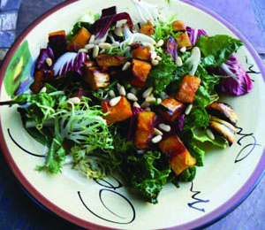 Once the squash is done, allow it to cool for 5 minutes. Top the salad with the squash, then scatter 1 Tbsp of pine nuts over each serving.