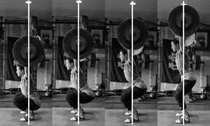 With a snatch-width hand placement and no hook grip, the athlete will place the PVC bar across the shoulders behind the neck as he or she would for a back squat and press it straight overhead without altering the position of the torso. This will place the torso at a slight forward incline, and the bar directly over the rearward base of the neck. The bar must also be centered directly over the lifter’s base—a vertical line drawn to the floor from the center of the bar’s diameter should pass through the foot just in front of the heel. Despite any changes of surrounding body positions during the overhead squat or snatch recovery, this spatial relationship of the bar to the feet must remain essentially the same. That is, even when the torso inclines forward to the greatest degree during the squat movement, the bar will remain above the center of base through the slight shifting of the arm position relative to the torso. Failure to maintain this position within a tight tolerance will result in the inability to support the load.