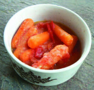 Simmer the carrots in the water over medium heat for 5 minutes. Add the tomatoes and continue to cook for 5 minutes more. Add the remaining ingredients, mix, then cook for 3 minutes. Serve hot.
