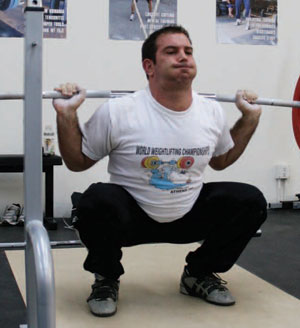 It is common knowledge that, in most cases, powerlifters and Olympic weightlifters use markedly different techniques in the squat. Olympic lifters generally squat with foot placement that is very close (or identical) to their foot placement in the receiving position of the clean and snatch. They place the bar high on the shoulders, around the base of the neck, and try to descend into the squat by pushing the knees forward and keeping the torso upright. Many people refer to this as a “high bar squat” and it is generally believed that this type of movement utilizes the quadriceps to a high degree. Incidentally, many bodybuilders squat with this style in an attempt to “isolate” their quads. Basically, an Olympic lifter’s squat is designed to mimic and strengthen the positions that the body will utilize during the competition lifts. It is an assistance exercise that functions to improve the snatch and clean and jerk, and the squat technique of most lifters will look roughly the same.