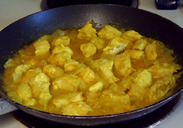 Cut chicken into bite-sized pieces, then add to onion and cook, stirring until browned. Add the turmeric and garlic pulp. Cook for 5 minutes, stirring frequently.