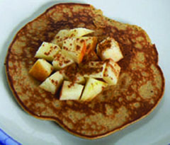 Once you've cooked all of your pancakes, you can serve them with a variety of toppings. A few that I like: chopped apples and cinnamon; heated blueberries; real maple syrup; and unsweetened applesauce.