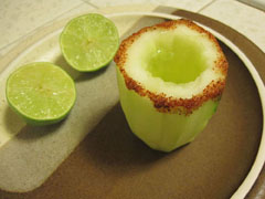 In a small dish, add sea salt, chili powder, and cayenne pepper to taste. Keep the cayenne on the light side unless you want it to be nice and spicy hot! Roll the edges of your cucumber glasses in the spice mixture.