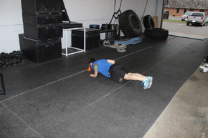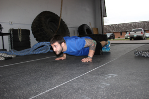 • 5 Plyo Pushups, Plank walk 10 yards down, 10 Yard Back, Burn out Pushups