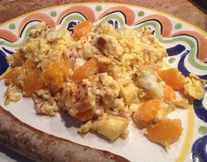 Heat the oil to medium in a small skillet, and then add the almonds. Toss until they just begin to turn brown, and then add the orange segments. Cook for around 2 minutes until they soften some. Add the egg mixture and scramble until done.