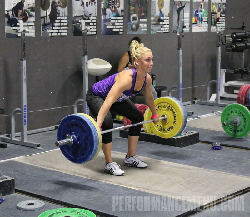 Snatch segment deadlifts and halting snatch deadlifts will probably be the best exercises for this. Make the top pause position for both mid-thigh—the point at which you’ll ideally initiate the final upward explosion (second pull). In this position, your shins should be vertical, shoulders at least slightly in front of the bar, back arched tightly, head and eyes forward, and weight slightly behind the middle of the foot—don’t get all the way back on your heels. Often athletes get their weight too far back in this position, and it results in a few potential problems, such as shifting too far forward in compensation, jumping back out from under the bar, or sweeping the feet back and landing on the toes.