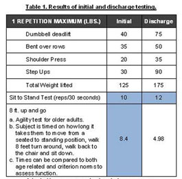 Last September, a student and I investigated the impact of a linear periodized resistance training program on muscular strength and power in individuals with Chronic Obstructive Pulmonary Disease. Before and after training, we measured participant’s 1RM in four lifts (deadlifts, bent over rows, step ups, and shoulder presses) along with scores on the sit to stand and 8 foot up and go mobility scale to determine baseline muscular strength and power. The training program we designed consisted of an endurance phase (60-75% of 1RM with 1-2 sets x 10-12 reps) and a strength phase (85% of 1RM with 2 set of 8 reps). We assumed that training at high loads and low volume would adequately compensate for the lack of a specific power phase. In table one, you can see the initial and discharge results of one of our participants, a 62-year-old male with moderate pulmonary disease.