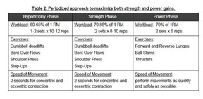 If I could redo the study, I’d shift the focus on the last two weeks to emphasize power development rather than maximize strength gains. Workouts would be built around movements that emphasize speed of force development and rapid changes in direction. As you can see in table 2, I’d replace deadlifts and shoulder press with thrusters, bent over rows with ball slams, and step-ups with lunges.