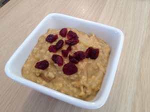 Add the cup of milk (or more water) and return to a boil. Stir in the oats and simmer for about a minute, and then add all of the remaining ingredients except for the raisins. Mix well and simmer on low for one or two minutes more, and then place into bowls to serve. Top each bowl with raisins.