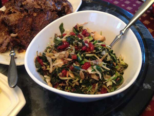 Add the almonds, chard leaves, and craisins to the larger skillet. Mix well, then add the remaining ingredients. Sauté until the leaves have softened. Adjust the salt, vinegar, and molasses to taste.