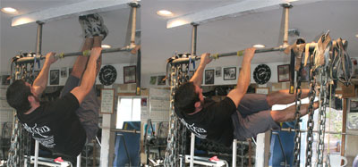 Hanging from a pull-up bar, lift your torso to horizontal . Bending the arms to achieve and maintain this position is fine—in fact, you may find that trying to maintain straight arms as you would in a proper front lever will bring the legs in too close to the bar and surrounding architecture to complete the movement uninterrupted. Eventually to make the movement more difficult, you can force yourself to keep your arms straight if your facility and anthropometrics allow.