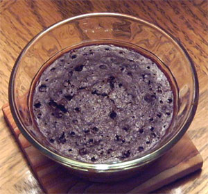 Place the cups inside of a larger baking dish. Add water to the large dish until it comes halfway up the sides of the cups. Carefully place into the oven preheated to 350 degrees. Bake for around 30 minutes. The soufflés should rise, and a skewer pushed into the middle should come out clean when they are done. Serve warm, possibly topped with some Paleo Ice Cream! (see Aug. '06 Performance Menu)