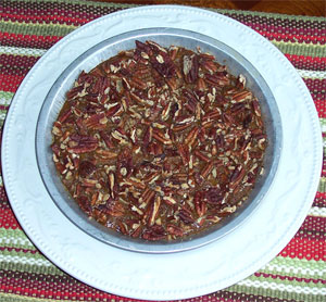 Combine all of the ingredients except the pecans in a bowl, mix well. Pour into a dish for baking pies. Cover with the pecans. Bake at 350 degrees for 45 minutes.